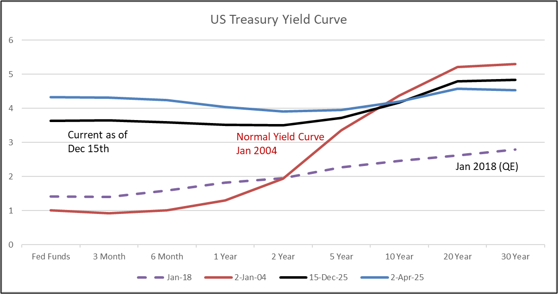 Figure #1 shows the current yield curve for Treasuries compared to when tariffs were announced, as well as a somewhat normal yield curve from January 2024. Yields on short and intermediate Treasuries are falling. The risk of rising national debt and inflation is pushing longer-term rates higher. Quantitative Easing pushed long-term rates lower in the decade following the Great Financial Crisis, as shown for 2018.