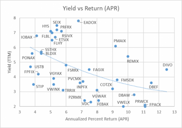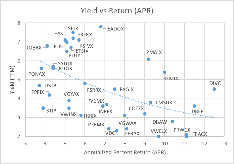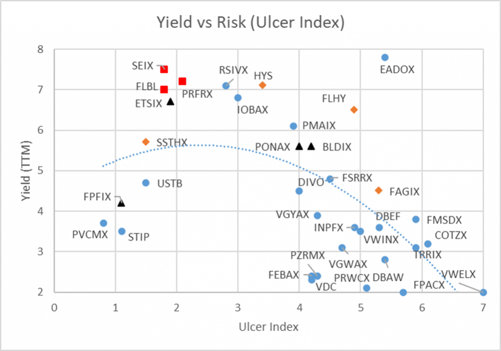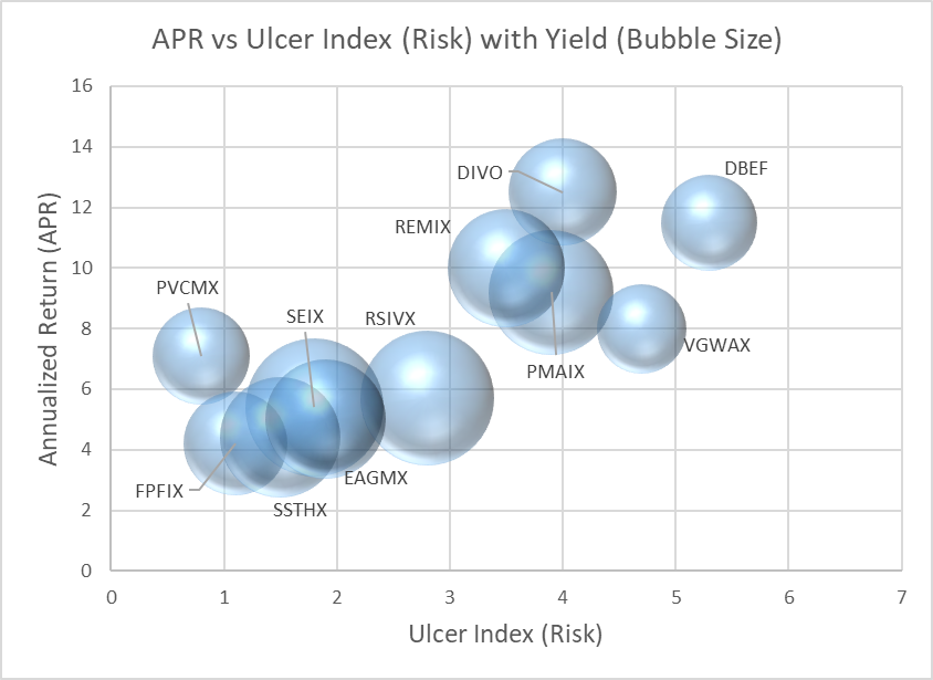In Figure #4, I selected funds with consistent risk-adjusted returns that pay a high yield (TTM). The bubble is proportional to the yield.