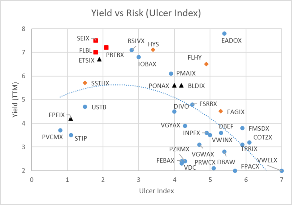 Figure #2 shows yield (TTM) versus risk as measured by the Ulcer Index for thirty-five funds in my 2026 watch list. The red squares are Loan Participation funds. Multi-sector funds (black triangle) have more diverse performance. Performance of high-yield funds (gold diamonds) is also very diverse. Those in the lower right-hand corner are mostly in the mixed-asset and flexible portfolio Lipper Categories. As pointed out earlier, funds with a lower risk of drawdown have yields that tend to fluctuate with the interest rate cycle, while higher risk funds have yields that tend to fluctuate with the stock market cycle. Those in between may have the potential to provide a steady income.