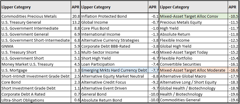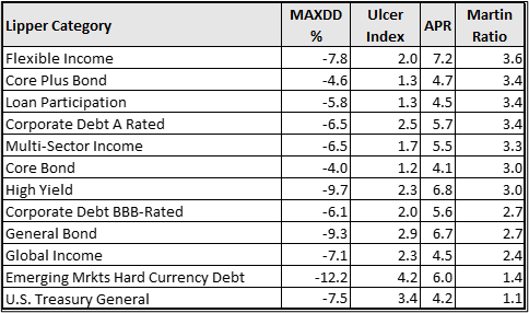 Table #3 shows some of the Lipper Categories where an investor had the potential to make at least 4% annualized in the decade beginning in 2010, and with relatively low drawdown. They are sorted from the highest risk-adjusted return (Martin Ratio) to the lowest.
