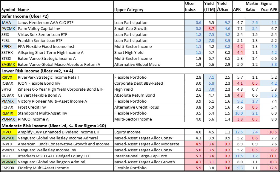 From a 30,000-foot view, Corporate Debt BBB-Rated, Multi-Sector Income, Short High Yield, and Loan Participation Lipper Categories have the potential to produce income in an environment with low yields on short-and intermediate Treasuries. From a 10,000-foot level, I identify funds that have consistent, high-risk-adjusted returns with respectable yields over the past twelve months (TTM), including capital gains. Arriving at the Ground Level, I create an example portfolio that would have achieved an APR of 7.7% for the past 5.9 years with a maximum drawdown of -9.8% and yield (TTM) of 5.2%.
