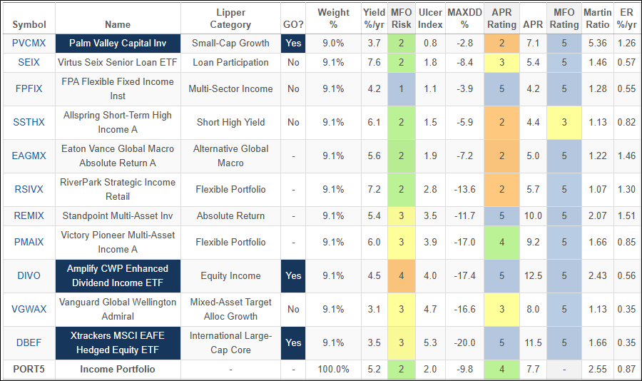 Table #4 is my short-list of income-producing funds. The five funds shaded blue are in my conservative Core TIRA. I own shares in the two green shaded funds in other accounts. I find the four funds that are shaded yellow to be potential buy candidates for the Core TIRA. “Sigma Year APR” is the “typical year-to-year variation in return APR since fund inception”.