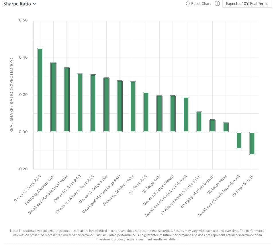 Their analysis also reinforces Goldman’s geographic thesis: looking across asset classes globally, US large-cap growth shows near-zero risk-adjusted returns (Sharpe ratio of -0.01), while developed ex-US large-cap value, emerging markets, and smaller international stocks all show meaningfully better prospects. The message is consistent: lighten on US growth, reduce overall equity exposure, look globally.