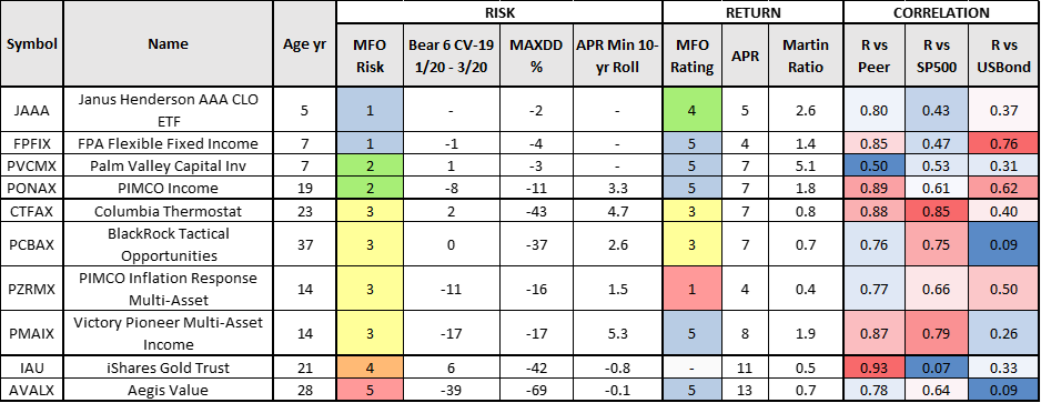 The funds can be loosely divided into three groups based on the past six years: 1) those that had low drawdowns (PVCMX, FPFIX, PCBAX, EAGMX), 2) those that had their maximum drawdown during The Great Normalization with rising rates (PONAX, PZRMX, CTFAX, and IAU), and 3) those that had their maximum drawdown during the COVID bear market (PMAIX, AVALX). Table #4 is the correlation matrix for the funds. They have low correlation with each other; however, PONAX, PZRMX, PMAIX, and CTFAX are moderately correlated.