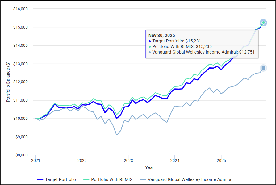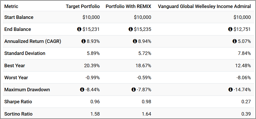 Figure #1 shows the growth of $10,000 invested in the Core TIRA with and without REMIX, and Vanguard Global Wellesley (VGYAX, VGWIX). I like how REMIX fits into the Core TIRA portfolio, and it increases income. I own Vanguard Global Wellesley in other accounts for its professional management and simplicity.