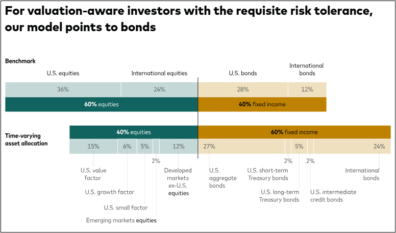 I use financial advisors at Vanguard to manage a portion of my portfolio using both index and actively managed funds. The time-varying strategy is not one of the options available. Over the past year, I have lowered my overall stock-to-bond allocation from 65% to 50% with a below-average allocation to technology because I expect stocks to have below-average returns. I invest in Vanguard Global Wellesley in other accounts, which has a 40/60 allocation, but also in Vanguard Global Wellington, which has a 60/40 allocation.