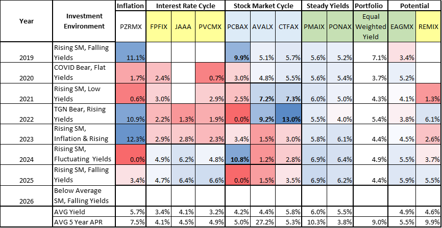 Table #1 shows the yields per year for each of the funds in my Core TIRA, with red shading indicating the lowest yield and blue shading the highest. All of the funds yielded at least 3.2% over the past six years, with PAIMX yielding 6.0%. Those whose inception date is after 2019 have the symbol highlighted in yellow. Three funds (FPFIX, JAAA, PVCMX) have higher yields when interest rates are high, and may have downward pressure on yields as interest rates fall. Those whose yield fluctuates more with the stock market cycle (PCBAX, AVALX, CTFAX) appear to have larger distributions when opportunities in the stock market appear to be low. PMAIX and PONAX have the most consistent distributions, with PMAIX having the potential for a higher total return. Of the two funds that I am considering adding in my mid-2026 review, EAGMX has high steady yields, while REMIX has a low correlation to the S&P 500 and bonds, and a higher potential for total return.