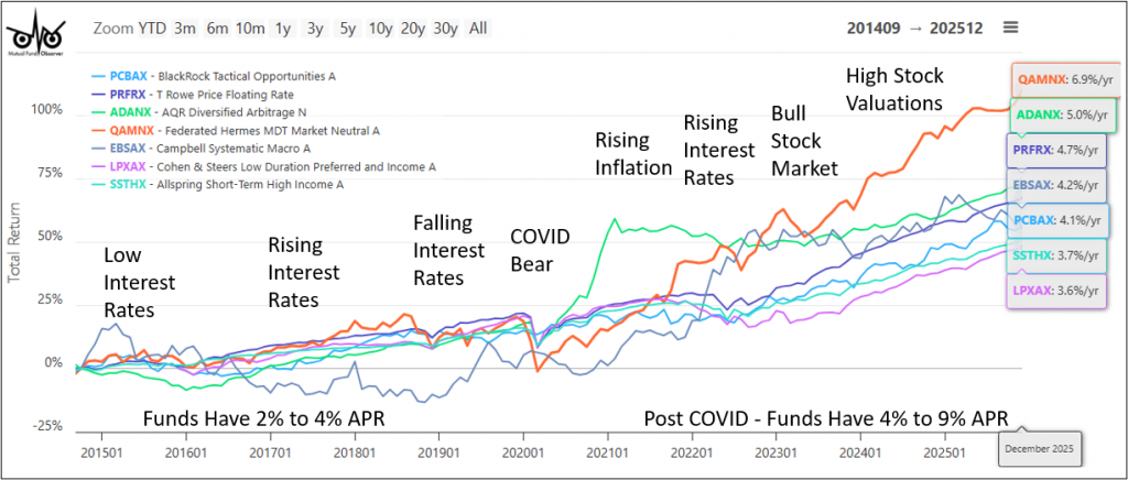 AQR Diversified Arbitrage (ADANX) and Campbell Systematic Macro (EBSAX) have returned just over 4% for the past twelve years, but only about one percent for the first six years.