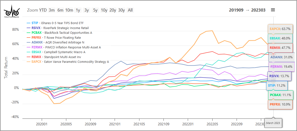 I look for alternative funds like BlackRock Tactical Opportunities (PCBAX) that increase somewhat steadily over time with high risk-adjusted returns. I own shares of PCBAX. I am becoming more comfortable with alternative funds like AQR Diversified Arbitrage (ADANX) with modest returns over time that act more as insurance during stressed markets.
