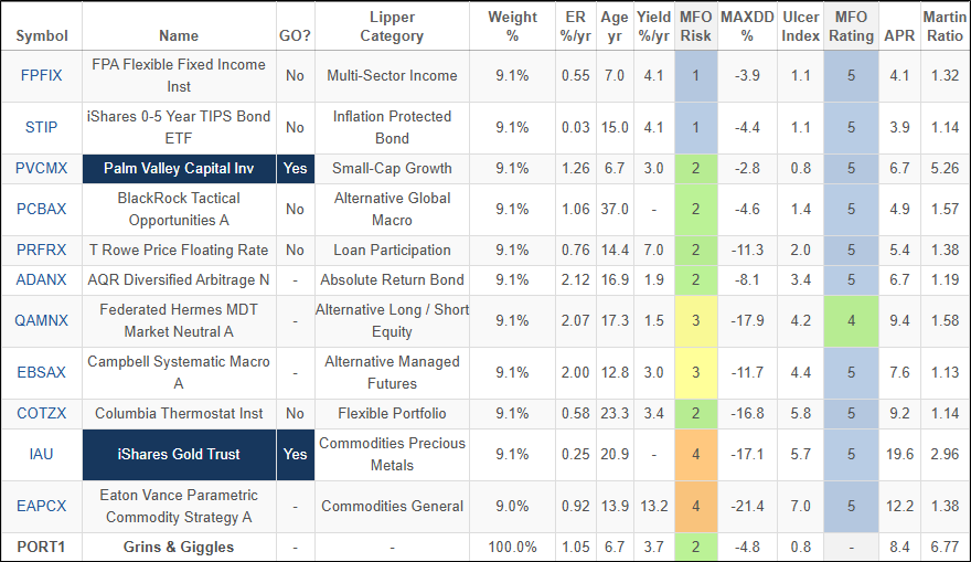 I used Excel Solver to minimize the correlation of the funds given constraints of a minimum annualized return of 8%, and drawdowns of less than -8% in both the COVID Bear Market (2020) and Great Normalization Bear Market (2022). Table #1 contains the Grins and Giggle Portfolio. Three of the funds (PVCMX, PCBAX, and IAU) are already in my Core TIRA portfolio. The funds are sorted by composite MFO Rating to reflect long-term risk.