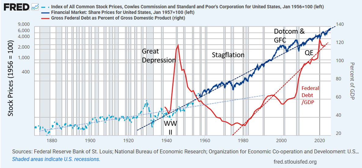 The stock prices are shown in nominal values, but inflation and the devaluation of the dollar have played a role. The Gold Reserve Act of 1934 devalued the dollar, and President Richard Nixon ended international convertibility of the dollar to gold in 1971. Some of the growth in stock market prices was financed by rising debt, which now poses challenges to future growth.