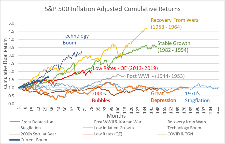 For this article, I estimated the inflation-adjusted returns of the S&P 500 for ten periods since 1929. Three periods covering 45 years saw no positive returns. Five periods covering 38 years produced the majority of the real returns since 1929. Sixty percent of these years (24 years) with high gains came during two time periods: 1) Peace time recovery period following the end of World War II and the Korean War, and 2) Stable Economic Growth following the stagflation of the 1970s and the end of the Cold War. The remaining periods (15 years) of high real stock market returns are during the periods of: 1) run-up to the Dotcom Bubble with high valuations, 2) low interest rates following the Great Financial Crisis when interest rates were suppressed, and 3) the past three years of rising equity valuations.