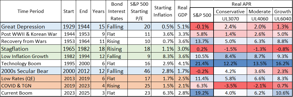 The information is shown in Table #1 along with some factors that influence stock market returns. Boom periods create excesses, which are followed by busts. High stock market returns are influenced by many factors besides economic growth, including population growth, valuations, wars, stability, uncertainty, geopolitical risk, globalization, technology, inflation, interest rates, and pandemics, among others. The blue-shaded periods covering 27 years (Great Depression & Bursting of Dotcom followed by the Great Financial Crisis) are when mixed-asset portfolios outperformed an all-equity portfolio. The two periods shaded green, covering 30 years (1970s Stagflation followed by low inflation with falling rates), are when mixed-asset portfolios performed about as well as an all-equity portfolio.